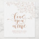 White and pink rose gold "Love you more than wine" Valentine's Day personalised wine bottle label in romantic and elegant handwriting typography. Customise with short greeting/message and sender/gifter's name.