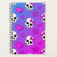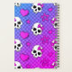 This design features a pattern of white skulls with pretty pink stars, hearts and bows on a pink and blue chequered background.