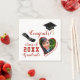 Create stylish white and red graduation napkins for the class of 2023 graduate with a heart-shaped photo (use the template to upload your picture), Congrats saying, and grad's cap and diploma illustrations. It's easy to change the background colour inside the design tool to match your school colours. Please, personalise with the graduate's name and surname, upload a custom photo, and add a year before ordering.