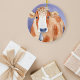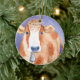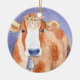 From the traditional English carol "The Friendly Beasts" comes the cow all white and red. The watercolor painting has a violet background with the cow staring out from the ornament. A cowbell hangs around her neck, and she is ready to sing of the gifts she gave Emmanuel, along with the other beasts. Perfect to share with children to help them understand the important lesson of giving during the holiday season.
