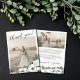 Floral wedding thank you card with your beautiful wedding photo printed on the front with thank you in a pretty script, and an illustrated arrangement of white anemons, eucalyptus, and greenery adorning the bottom right corner of the flat wedding thank you card. On the other side, add two more photos from your wedding photo shoot, your personalised thank you message, and your names above more pretty white flowers with greenery in soft shades of green along with a deeper palette of mossy green and burnt orange.