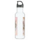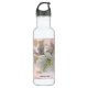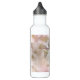 Water bottle with a photograph featuring an apple tree branch displaying its beautiful white apple blossoms.