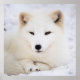 Photo of a cute white arctic fox resting in the snow. The animal has white fur and brown eyes and is looking at you. A real diva!