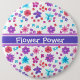 A pretty round Button or Badge, with a pattern of bright flowers in purple, turquoise, pink and orange on a white background, from a handpainted paper collage by Judy Adamson. You can easily change the background colour, if you wish, by using the Edit button.