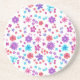 A pretty round, sandstone coaster, with a pattern of bright flowers in purple, turquoise, pink and orange on a white background, from a handpainted paper collage by Judy Adamson. You can easily change the background colour, if you wish, by using the Edit button.