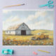 Decoupage tissue paper featuring a vintage white barn and classic yellow truck, ideal for adding a rustic, nostalgic touch to your projects.