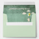 Cute boy birthday card invite envelope. Green with clouds. Little bear floating up to clouds with balloons.