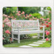 A peaceful garden scene features a white wooden bench surrounded by vibrant pink and red roses