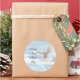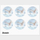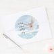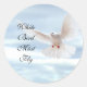 Round sticker to match our "White Bird" invitation with an image of a white dove in a cloudy blue sky and the words “White Bird Must Fly” in black script.