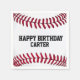 Extreme close-up of a white baseball with red stitching, customised name, and happy birthday text.