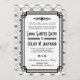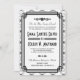 These wedding invitations feature a black and white colour palette, a geometric frame, geometric patterns, and other stylistic details all inspired by Art Deco and the roaring twenties. You can customise the sample text fields to your liking.