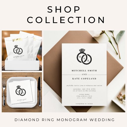 Simple black and white wedding return address labels with diamond ring monogram. Personalise it with your event details.