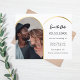 On front: Add your own vertical size photo. A faux gold photo arch frame. A classic white background, black text. Personalise and add your nams and the date.