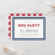This barbecue party invitation features blue borders on the the front and red gingham pattern back side.