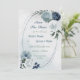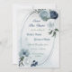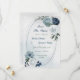 Beautiful botanical save the date card featuring white, dusty blue and navy blue flowers with green leaves on a romantic geometric frame.