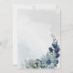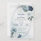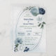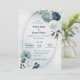 Beautiful botanical wedding invitation featuring romantic white, dusty blue and navy blue flowers with green leaves on a pretty geometric frame.