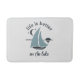 A cute bath mat, perfect for a lake house or those who simply love sailing. With a very light grey background, there is an image of a blue and grey sailing boat and the dark grey typography reads "Life is better on the lake".