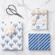Hanukkah pattern wrapping paper sheets in blue, white, and yellow with menorahs, stars of Davids, and stripes.