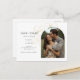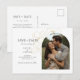 These modern minimalist wedding save the date postcards feature a boho arch couple photo, delicate imitation gold floral elements and a contemporarty set of fonts in jet black. Flower detail is repeated at the back. This design is contemporary and chic. Perfect for the stylish and elegant couple.