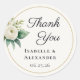 Add the finishing touch to your wedding favors and stationery with these classic round 'Thank You' stickers. Featuring a delicate white flower nestled in soft green foliage in a watercolor style, this design is framed by an elegant faux gold border. The layout features a timeless script 'Thank You' paired with clean serif typography for your names and wedding date. Whether you're sealing thank you notes or labeling guest favors, this botanical design adds a chic, romantic touch to your special day. Simply click 'Personalize' and update the names and wedding date on the template.