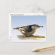 This postcard features the White-breasted Nuthatch, an adorable little bird who climbs up and down tree trunks like a miniature woodpecker foraging for insects. He seems very pleased to have just found the perfect seed! He is a stocky bird, with a large head, short tail, powerful bill and strong feet. The upperparts are pale blue-grey, and the face and underparts are white. He has a black cap. The nuthatch is a noisy species with a wide range of vocalisations.
