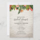 A beach wedding bridal shower invitation featuring an image of tropical flowers and leaves over a white brick background.