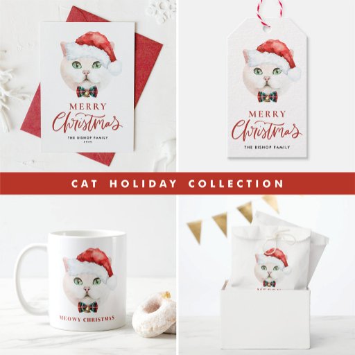 Happy Holidays! Send holiday greetings to family and friends with a cat-themed Christmas flat card. It features a watercolor illustration of a cute white British shorthair cat with a Santa hat and tartan bow tie. The texts are fully editable. Personalise by adding a greeting, names and message. This cat holiday card is perfect for cat lovers and pet owners.