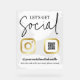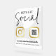 Acrylic let's get social sign with printed white brushstrokes, your QR code and faux gold social media icon personalised with your social media handle. Social media promotional sign with black fonts and white paint strokes printed on an acrylic background personalised with your QR code so your clients and customers can easily access your social media.