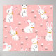 Seamless pattern of cute white bunnies on pink background with floral elements.