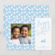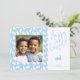 Celebrate Easter with this personalizable photo card designed by Destei. One side features a square spot for your photo that is framed with a thin white border and set against a light blue background patterned with white bunny silhouettes. The other side has a white background with “Happy Easter!” in playful tilted blue text, a lying-down blue bunny silhouette and space to add a name and year. The back of the card repeats the white bunny pattern over the blue background, creating a cohesive design perfect for spring greetings.