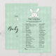 A white bunny rabbit above game title with green diamond argyle background. Templates created for you. This is a Baby Candy baby shower game.