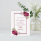 On front: A white background with a simple burgundy coloured frame. Decorated with flowers, roses in burgundy and peach. Templates for Your names and wedding details. The names are written with a hand lettered style script, burgundy coloured letters.