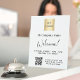 Classic, modern elegant white background. Personalise and add your company name, opening hours, business logo and your QR colde to your website or social media account. Black text.
