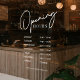 Minimalist and modern business opening hours window cling template, featuring white text on transparent background. This editable window decal is a great way to display your company's opening times on your shop window - can be used for your store, salon or spa, cafe, restaurant or any other business.