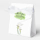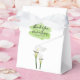 This design features white calla lily flowers and a green watercolor paint stroke in the background. An elegant design representing greenery through the use of watercolor matching the green stems of the calla lilies. This simple yet elegant floral design can be incorporated into any wedding theme. Unique wedding favour box design with modern elements. Matching wedding invitations and other stationery items are also available.