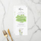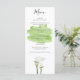 This design features white calla lily flowers and a green watercolor paint stroke in the background. An elegant design representing greenery through the use of watercolor matching the green stems of the calla lilies. This simple yet elegant floral design can be incorporated into any wedding theme. Unique wedding menu card design with modern elements. Matching wedding invitations and other stationery items are also available.