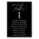 Elegant white calligraphy "table", with guest names listed and table number, wedding table number seating chart card. Background colour shown in black, can be customised.