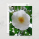 A photo of a white Camellia in a tree against a background of leaves and the sky.