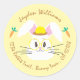 A cute yellow round return address sticker with a white cartoon bunny . This design is also available in red , blue and green .