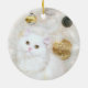 Beautiful white persian kitty cat with golden eyes in front of a white Christmas tree with matching gold ornaments cat lovers Christmas holiday ornament