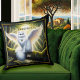 Pillow featuring a painting of a white angel cat in a lush forest. Heavenly bliss!