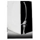 A curious white cat peeks around a sharp, contrasting corner of darkness and light.