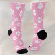 Cute pink women's socks with the pattern of white snowy cat paw prints .