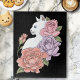A profile of a white cat with pink, lavender and peach coloured roses in a backdrop of black