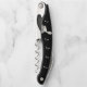 This corkscrew is black with a white cat with a fluffy tail standing on top of piano keys with white music notes on both sides.