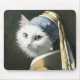 A white cat wearing a blue and yellow headscarf and a pearl earring, styled to resemble a famous portrait