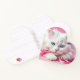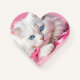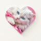 Beautiful white cat with blue eyes and tangled pink ribbons on pink.