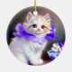 Ornament featuring a gorgeous white kitten! A fluffy kitten wears a purple flower collar. A blue bowl of white and purple flowers sits to the right. A marvellous gift for cat lovers and Victorian art enthusiasts!