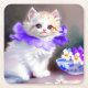 Paper Coasters featuring a gorgeous white kitten! A fluffy kitten wears a purple flower collar. A blue bowl of white and purple flowers sits to the right. A marvellous gift for cat lovers and Victorian art enthusiasts!