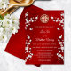 White cherry blossom branches and two butterflies with a red shimmering background. Chinese wedding invitation / tea ceremony invitation with a real gold foil shuangxi double happiness symbol.